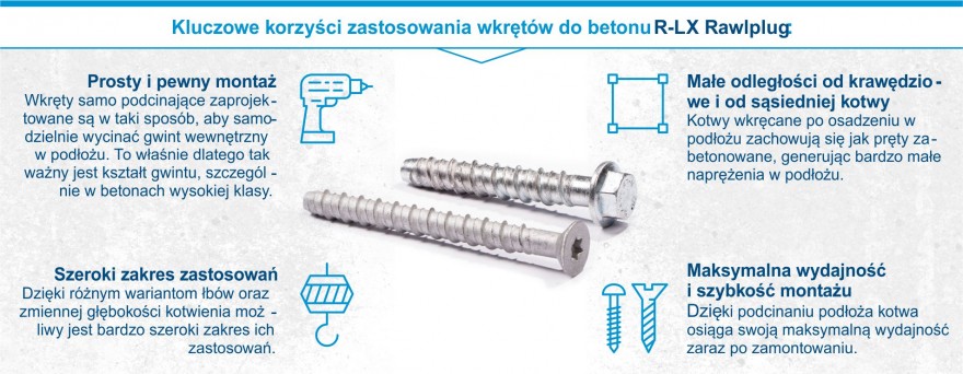 Wkręty do betonu R-LX Rawlplug to faktyczne połączenie najnowszej dostępnej technologii oraz 100-letniego doświadczenia w pracy nad rozwojem produktów. To najbardziej zaawansowanie technicznie rozwiązanie, które zapewnia imponujące właściwości użytkowe i wydajność. Nie bez znaczenia jest pakiet komplementarnych z oferowanymi produktami usług, jakie Rawlplug posiada w swoim portfolio: od doradztwa technicznego, przez specjalistyczne szkolenia, po kompleksową dokumentację. Warto je sprawdzić na rawlplug.com. Naszym zdaniem wybór jest prosty.