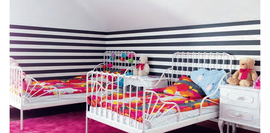 Dwie ściany w części do nauki mama dziewczynek pokryła papierową tapetą białą w czarne grochy, natomiast strefę snu wydzieliła tapetą w czarno-białe poziome paski, które ozdabiają część pokoju usytuowaną pod skosami i podkreślają jej horyzontalny układ. Tapety w czarne grochy oraz czarno-białe paski to wzory nieoczywiste, które sprawdzą się zarówno w pokoju niemowlaka, jak i ucznia. Wystarczy zamiast kochanych przez przedszkolaki różowych dodatków zastosować inne, a pokój zmieni swój charakter na bardziej dojrzały. Pani Kasia zdecydowała się na tapety papierowe, wykonane z dwóch warstw. Są nie tylko mocne i trwałe, ale też ocieplają ściany pokoju. Pozostałe elementy wystroju mama dziewczynek dobrała według ich klucza kolorystycznego. Jak mówi pani Kasia: „Mimo takiego wyboru kolorystycznego pokój wcale nie jest smutny ani nudny. Wręcz przeciwnie – przykuwa uwagę i dzieci odnajdują się w nim doskonale”.